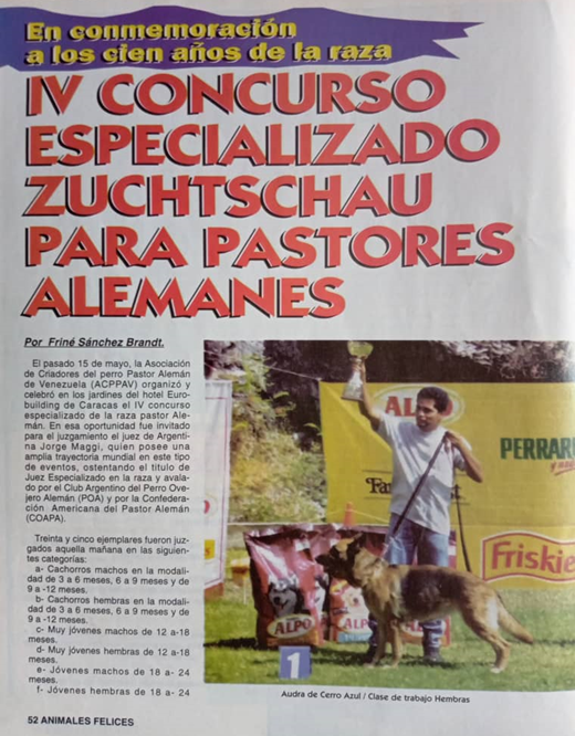 El 15 de mayo de 1996, se realiza la 4ta exposición de la ACPPAV. Teniendo el privilegio del juzgamiento del excelentísimo Juez y gran maestro de esta fabulosa raza, el argentino Sr Jorge Maggi del Club de Perros Ovejeros Alemanes POA y presidente vitalicio de la Confederación Americana de Pastores Alemanes - COAPA. Autor del libro considerado la “biblia del Pastor Alemán en lengua castellana” El Perro Ovejero Alemán.