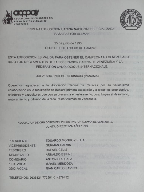 La primera actividad oficial de la asociación fue la exposición especializada realizada el 25 de Junio de 1993 en el club de Polo “CLUB DE CAMPO”. Dicha exposición era bajo las clases FCV y sistema de puntaje para campeonato venezolano FCV, por la cual esta exposición era válida para el campeonato venezolano, siendo juzgada por la Sra INGEBORG KINKAID (PANAMÁ), De esta manera, la asociación se estrena con un catalogo con 65 perros inscrito de las líneas existentes para la época. Predominaban descendientes de Uran vom Wildteigerland, Quando von Arminius, Dingo vom Haus Gero, Fanto vom Hitrschel y Fedor vom Arminius, entre otros…